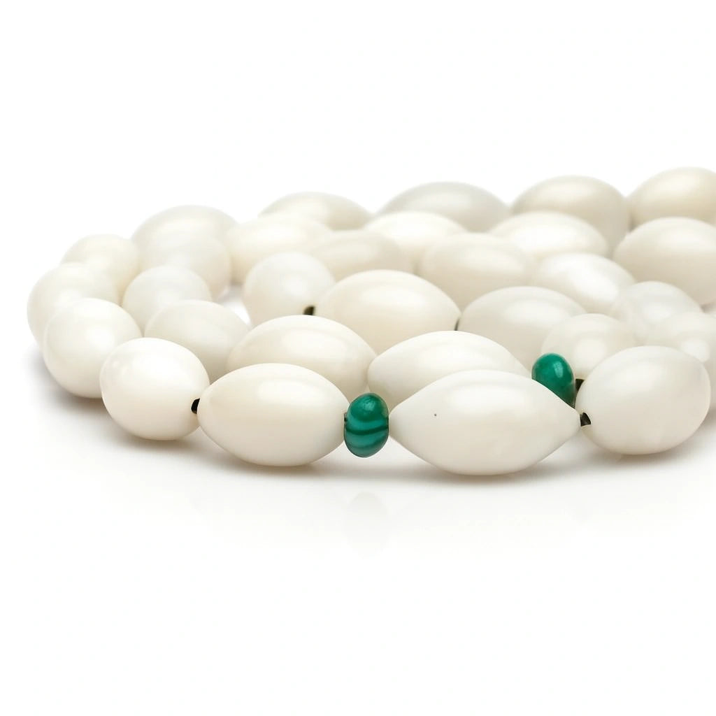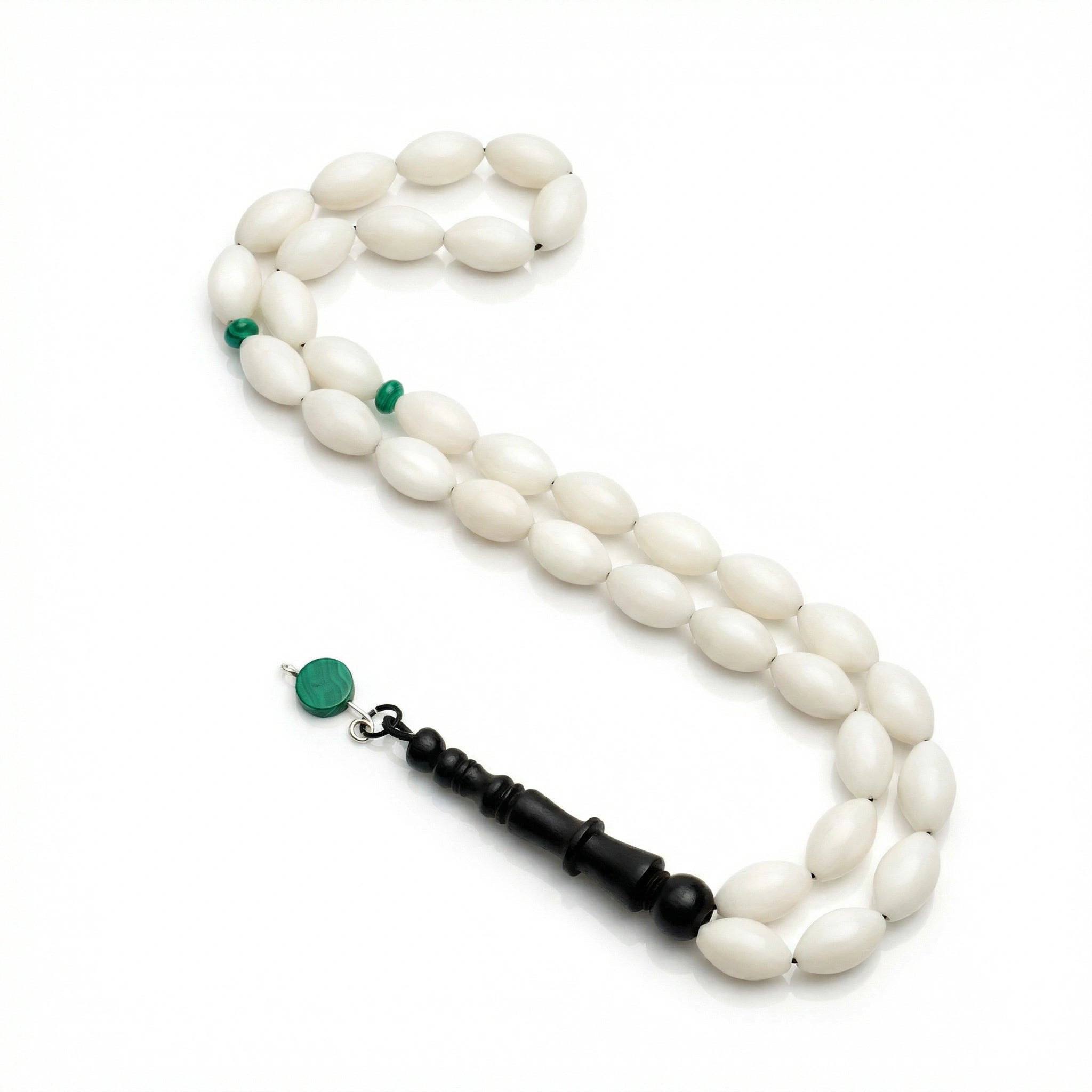 سبحتنا مصنوعة يدويا من صدف طبيعي أبيض 85% ممزوج مع مادة الريزن الشفاف بجودة عالية مع وامامة خشب ابانوس فاخر سبحة من تصميمنا مع توفر مقاسات مناسبة للاهداء مع علبة جلد أخضر أنيقة