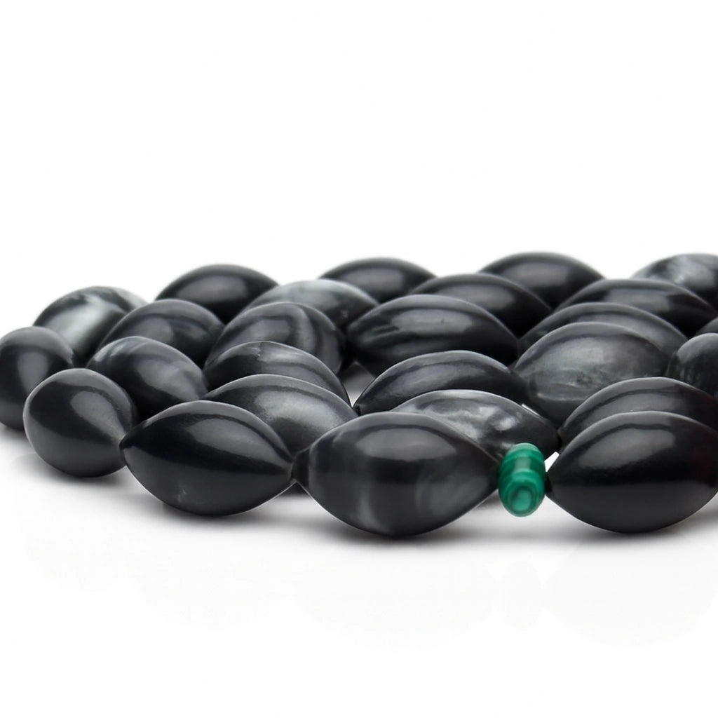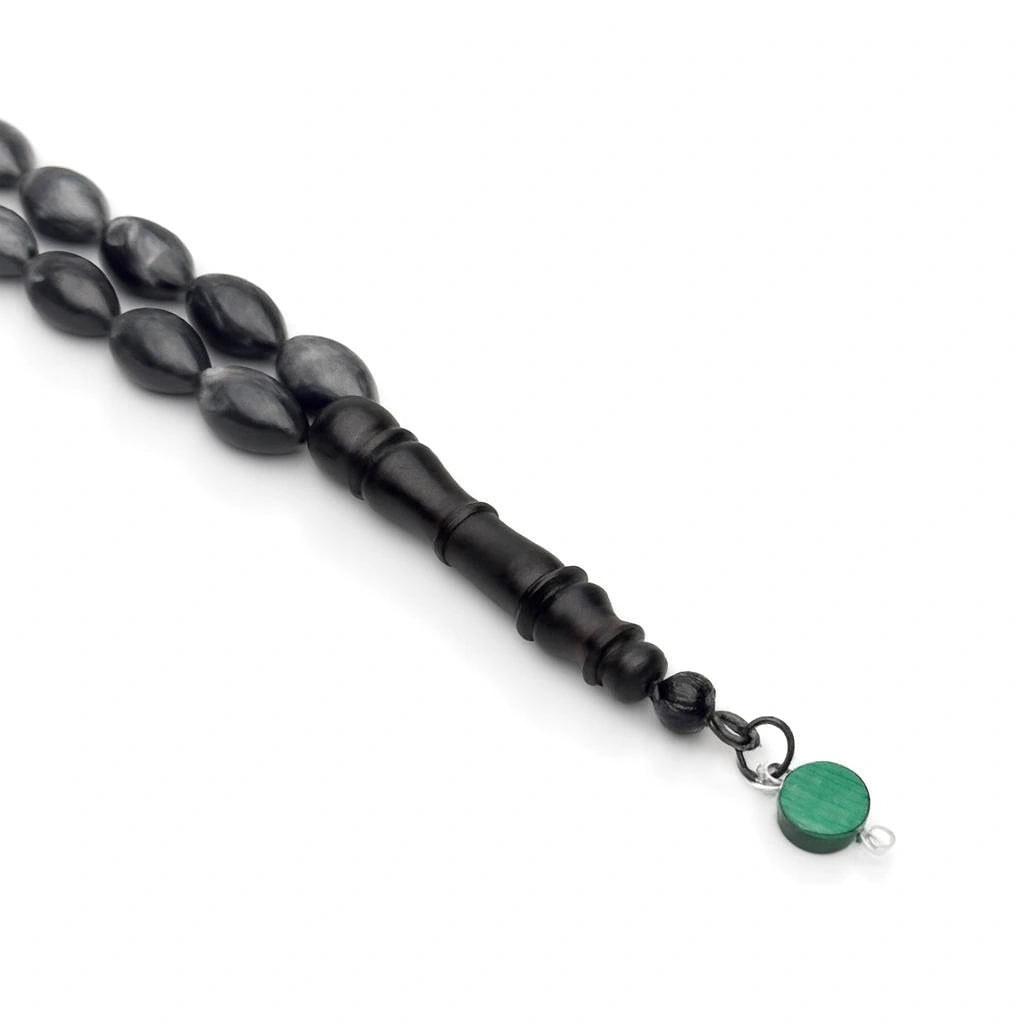 سبحتنا مصنوعة يدويا من صدف طبيعي رمادي 85% هادئ ممزوج مع مادة الريزن الشفاف بجودة عالية مع وامامة خشب ابانوس فاخر سبحة من تصميمنا مع توفر مقاسات مناسبة للاهداء مع علبة جلد أخضر أنيقة